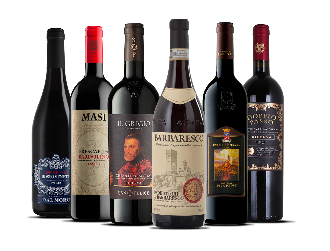 Questo pacchetto ti porta in un tour dall'eleganza del Nebbiolo del Piemonte alla profondità del Sangiovese della Toscana e al carattere audace dei classici del sud. Questi sei vini mostrano la diversità e il prestigio dei rossi italiani più famosi, da quelli raffinati e adatti all'invecchiamento a quelli morbidi e fruttati.