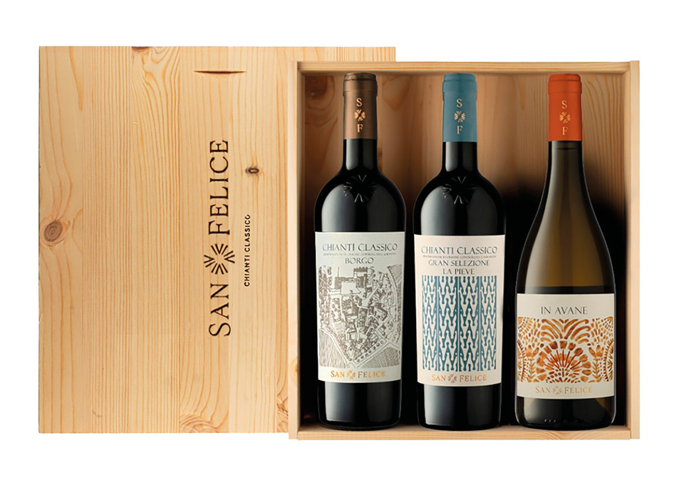 Questa cassetta in legno firmata San Felice racchiude tre vini d’autore che raccontano, con stile e autenticità, la ricchezza del terroir di Castelnuovo Berardenga. Un rosso giovane e vibrante, una Gran Selezione di grande eleganza e un bianco sorprendente danno vita a una selezione che attraversa le diverse anime della produzione San Felice, unendo tradizione toscana e spirito innovativo.