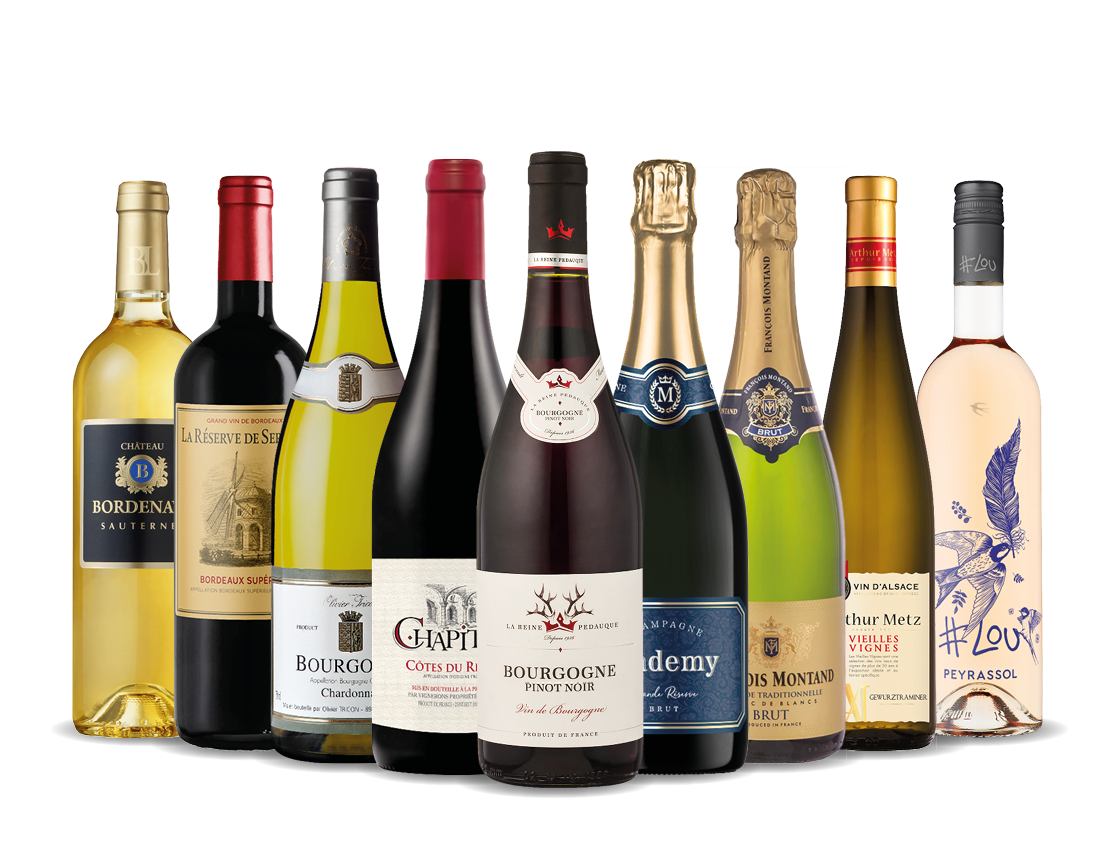 From the intense reds of Bordeaux and Côtes du Rhône to the velvety delicacy of Burgundy Pinot Noir, the aromatic freshness of Loire Valley Sauvignon, and the spicy richness of Alsatian Gewürztraminer, each wine brings you a different corner of France. The Provençal rosé is not to be missed—a symbol of lightness and joie de vivre—along with, of course, sparkling wines: a refined Champagne and an easy-drinking traditional method. To finish, a sweet and enveloping Sauternes, perfect for festive desserts.