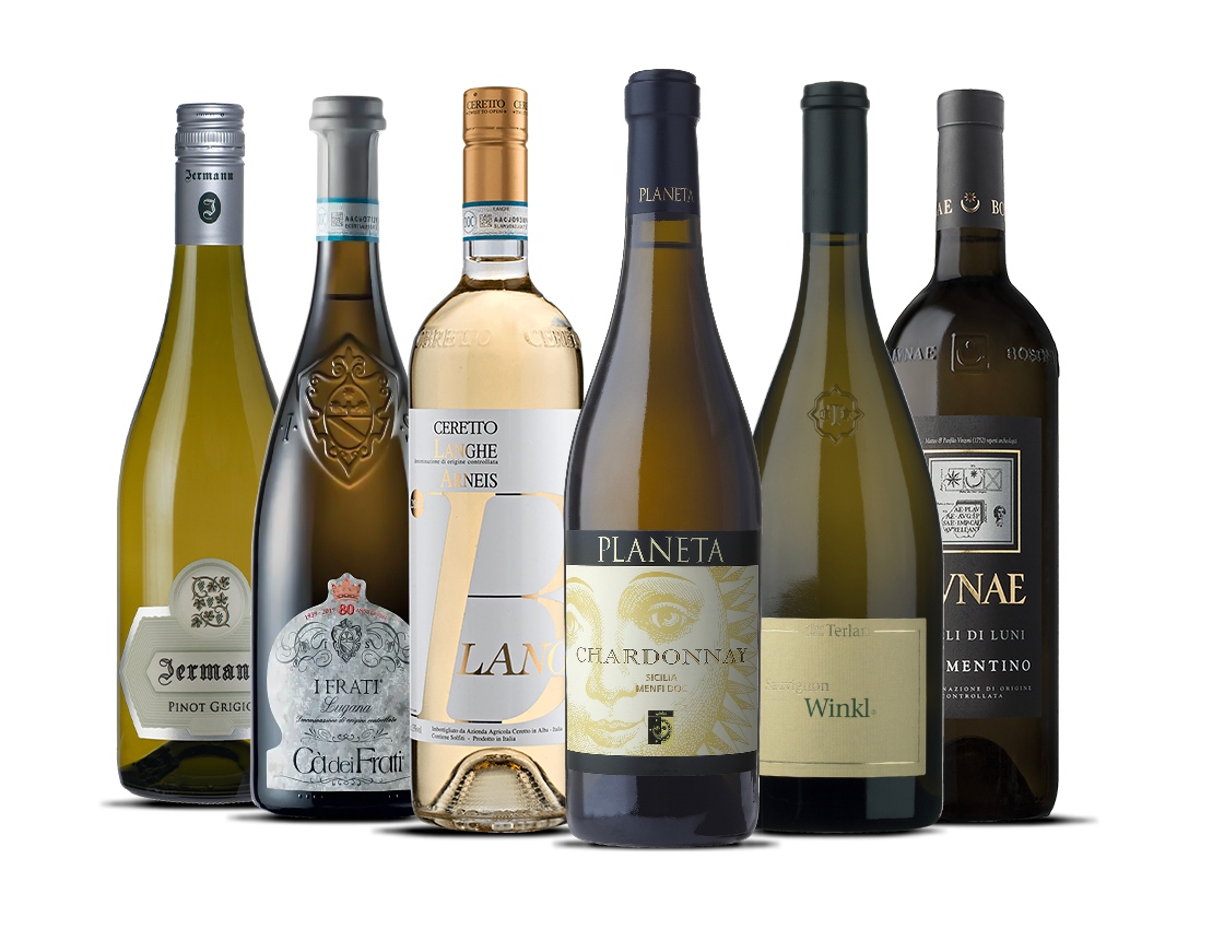Each bottle represents an important signature in the wine scene: the Vermentino di Lunae from Colli di Luni, the Friulian Pinot Grigio by Jermann, the Arneis Blangè from Langhe signed by Ceretto, the elegant Lugana from Ca' dei Frati, the aromatic Sauvignon from Alto Adige by Cantina Terlano, and the rich Sicilian Chardonnay by Planeta. Different wines in style and region, but united by finesse, balance, and an extraordinary ability to tell the identity of their place of origin.