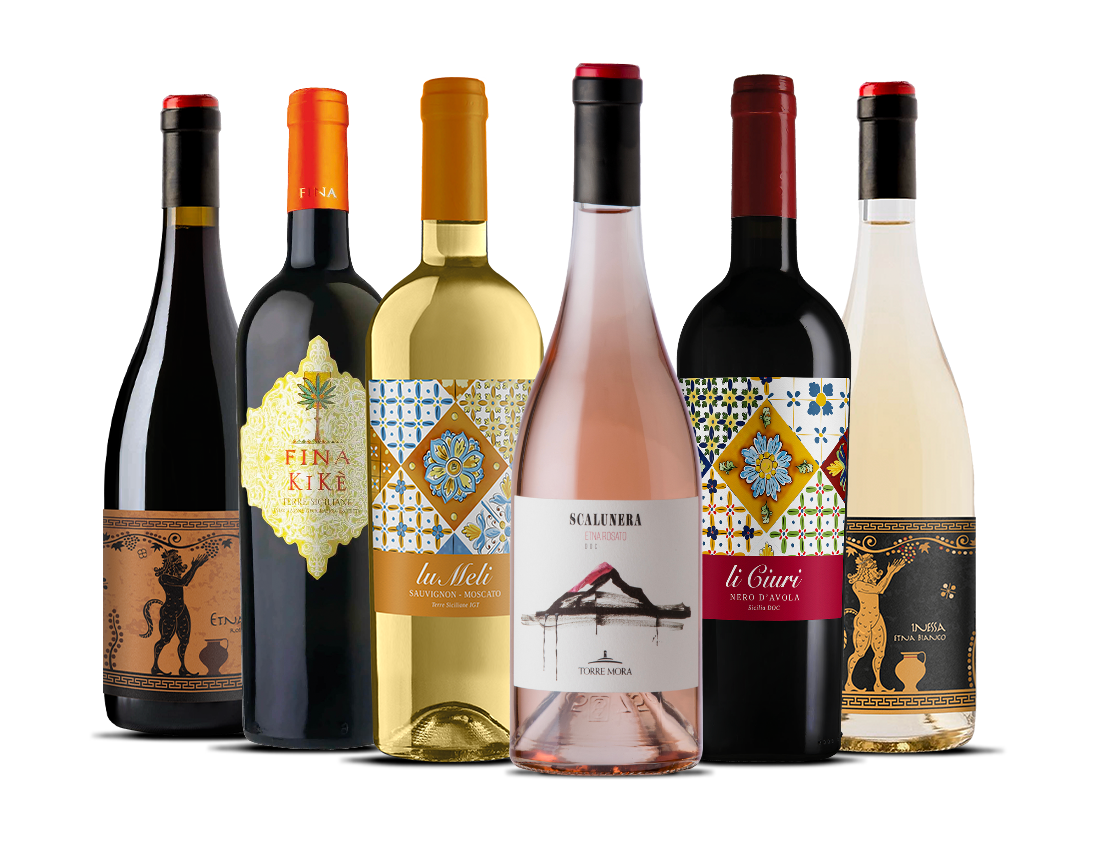 Le voyage commence sur l'Etna, avec un Etna Rosso élégant et volcanique, et un surprenant Etna Rosato Scalunera, frais et savoureux comme une brise du soir. Le Nero d'Avola de Li Ciuri apporte fruit, soleil et caractère, tandis que le Kikè, mélange aromatique de Traminer et Sauvignon, sent les fleurs et les agrumes. Lu Meli, avec son mélange de Moscato et Sauvignon, est un blanc vif et fruité, parfait pour l'apéritif. Pour finir, l'Etna Bianco d'Inessa, minéral et rafraîchissant, idéal avec des plats de poisson et des salades méditerranéennes.