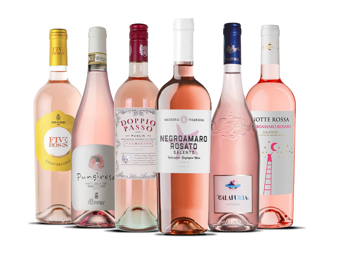 Stilens variation är förvånande: från den omedelbara friskheten hos Notte Rossa och Calafuria, till de intensiva aromerna och mjukheten hos Primitivo av Doppio Passo, till den historiska elegansen hos Five Roses Anniversario, en av Italiens mest ikoniska roséer. Pungirosa av Rivera, från Bombino Nero, kompletterar urvalet med en mer vertikal och raffinerad struktur. Varje flaska uttrycker Apuliens generositet och lyfter fram olika nyanser av frukt, mineralitet och intensitet.