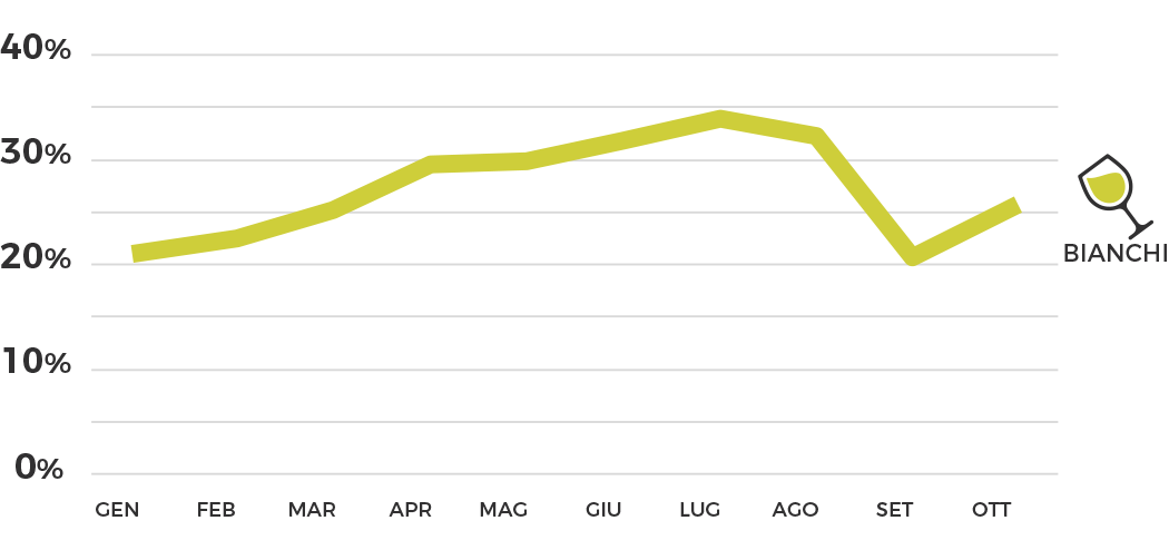 När det gäller vita viner , med hänsyn tagen till årets första tio månader, sjönk den totala andelen från 28,27 % 2021 till 26,14 % 2024, samtidigt som en trend som påverkas av sommarens säsongsvariationer med en topp i genomsnittet för konsumtionen på 31,98 % i den juli och augusti mot 20,45 % i januari.