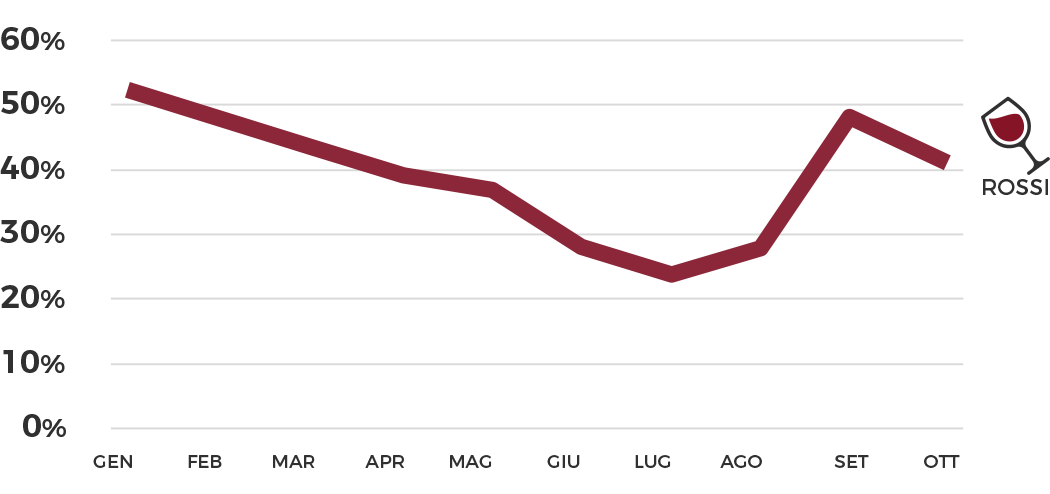Rött vin anses vara ett utmärkt vin utomlands, även utanför Italien genomgår konsumtionen säsongsvariationer, vilket visar en nedgång i försäljningen under sommarmånaderna jämfört med perioden januari-februari. Den verkliga skillnaden med Italien representeras av den totala andelen sålda flaskor rött vin, lika med 52,39 % under de första tio månaderna 2024 och ökade med +10,34 % jämfört med samma period 2021.